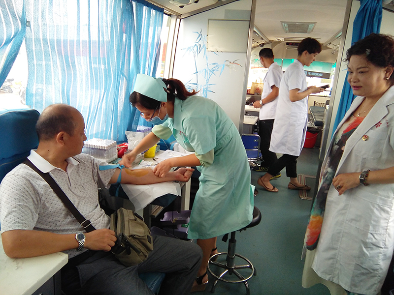 献血期间,气温高达近四十度,高温酷暑不能阻挡公交人奉献爱心的步伐,机关管理人员和一线驾驶员纷纷登上停在公交大院内的献血车,在医务人员的指导下,认真填写登记表,体检、化验、献血整个过程紧凑有序,气氛轻松愉悦。他们当中既有第一次献血的“新人”,也有连续多年献血的老同志,更有国家和省市级献血模范,虽然他们的年龄、工作经历各有不同,但大家都用有限的血液向社会传达着无限的大爱。