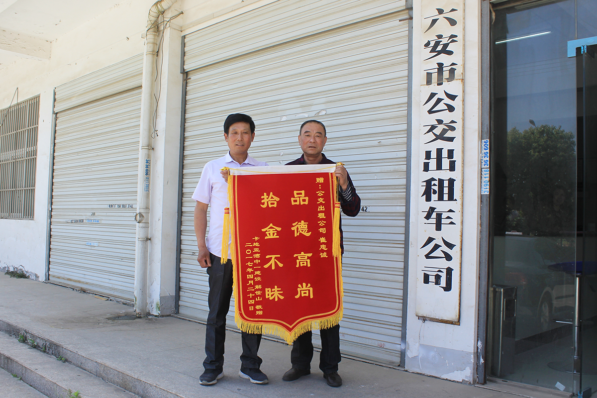 4月24日,失主解先生将一面写有“拾金不昧,品德高尚”的锦旗送到了六安市公交出租车服务有限公司,对皖n81088号公交出租车司机崔忠诚师傅拾金不昧的行为表示感谢。