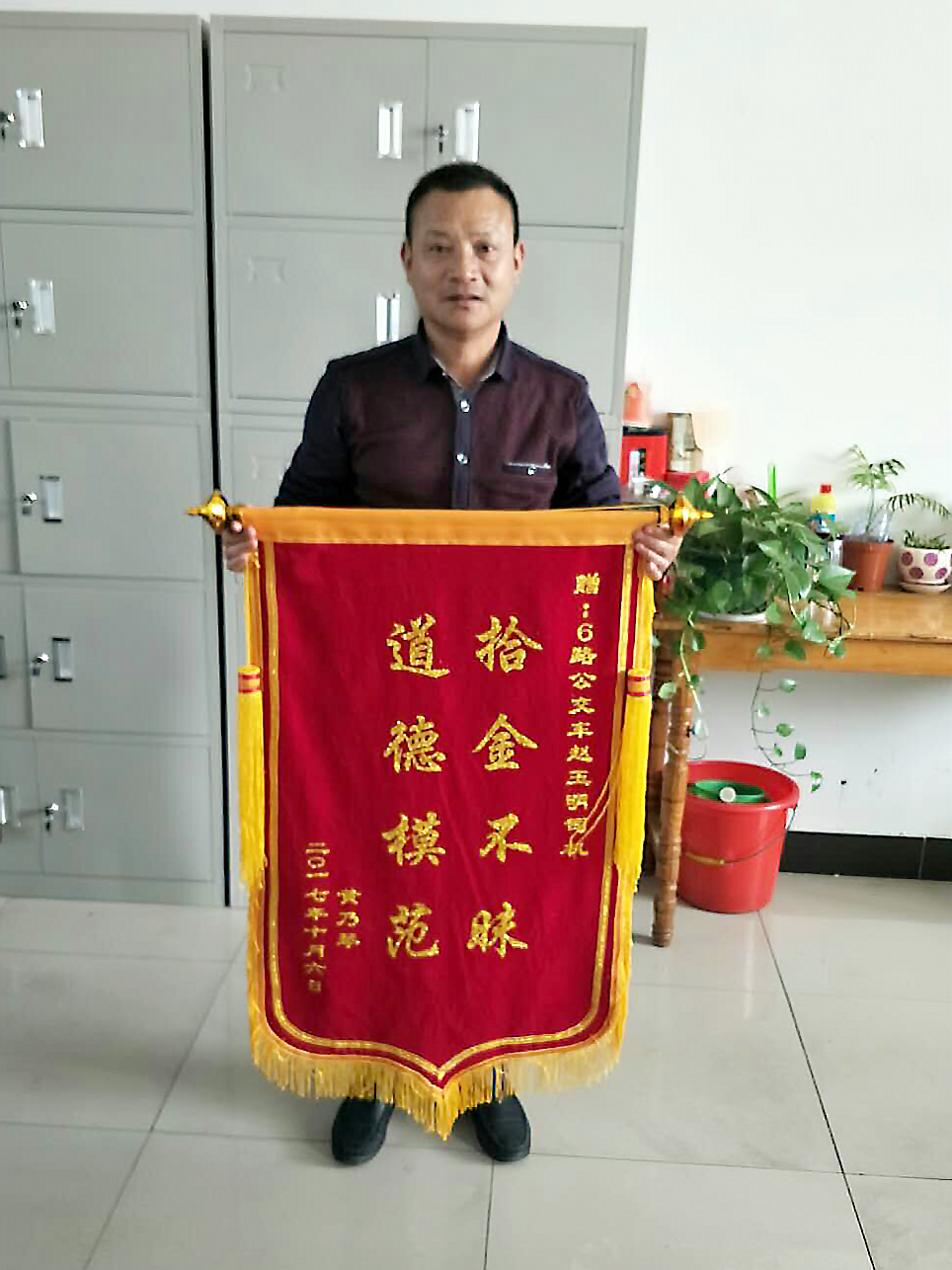 10月6日上午,失主黄乃琴将一面写有“拾金不昧,道德模范”的锦旗送到了六安公交行车四队,对6路公交车驾驶员赵玉明拾金不昧的行为表示感谢。