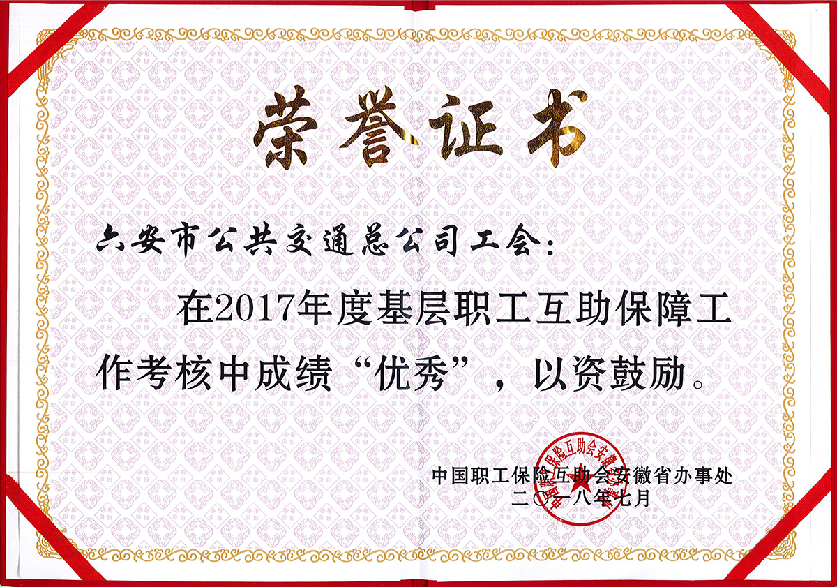 2018年7月,市公交总公司工会被中国职工保险互助会安徽省办事处授予“2017年度基层职工互助保障工作考核成绩‘优秀’单位”荣誉称号。