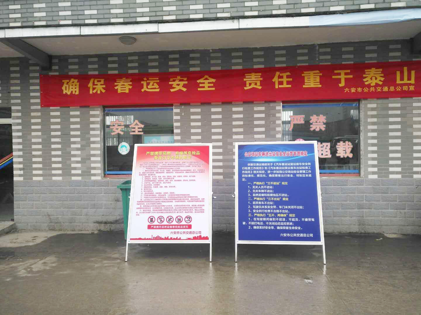 加大安全宣传力度。六安公交充分利用各种平台加强“春运春节”期间安全宣传力度。在城区和城乡所有公交场站悬挂安全横幅,设立宣传展板;利用信息中心平台、短信、微信、公交车车载电视、语音提示语推送和播放严禁携带易燃、易爆危险品乘车以及反恐防暴方面的宣传内容,提高乘客遵守乘车规则意识,营造公众安全出行的良好环境和氛围。