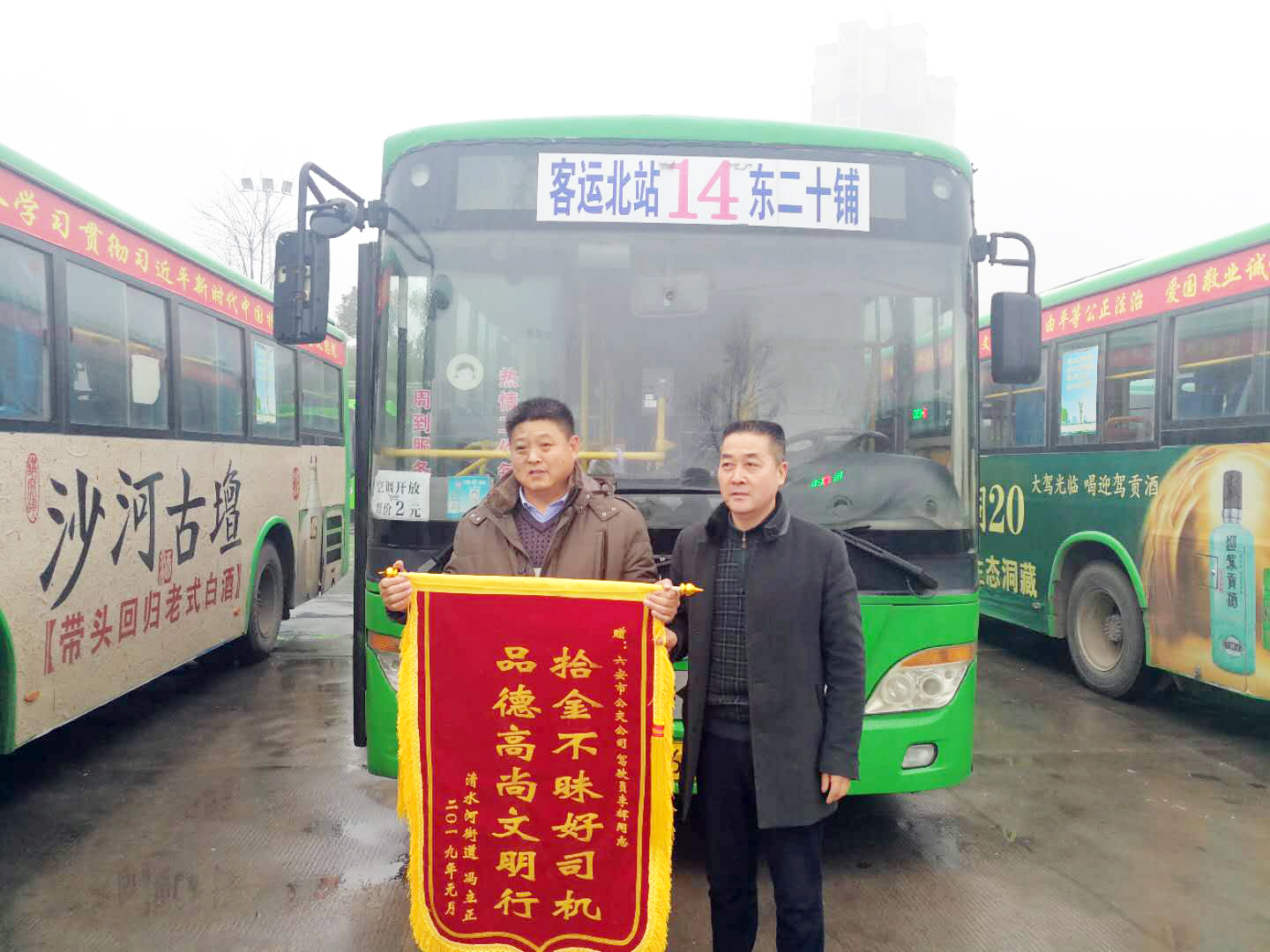 元月30日上午,失主冯先生将一面“拾金不昧好司机 品德高尚文明行”的锦旗送到六安公交行车三队,对14路驾驶员李辉拾金不昧的行为表示感谢。