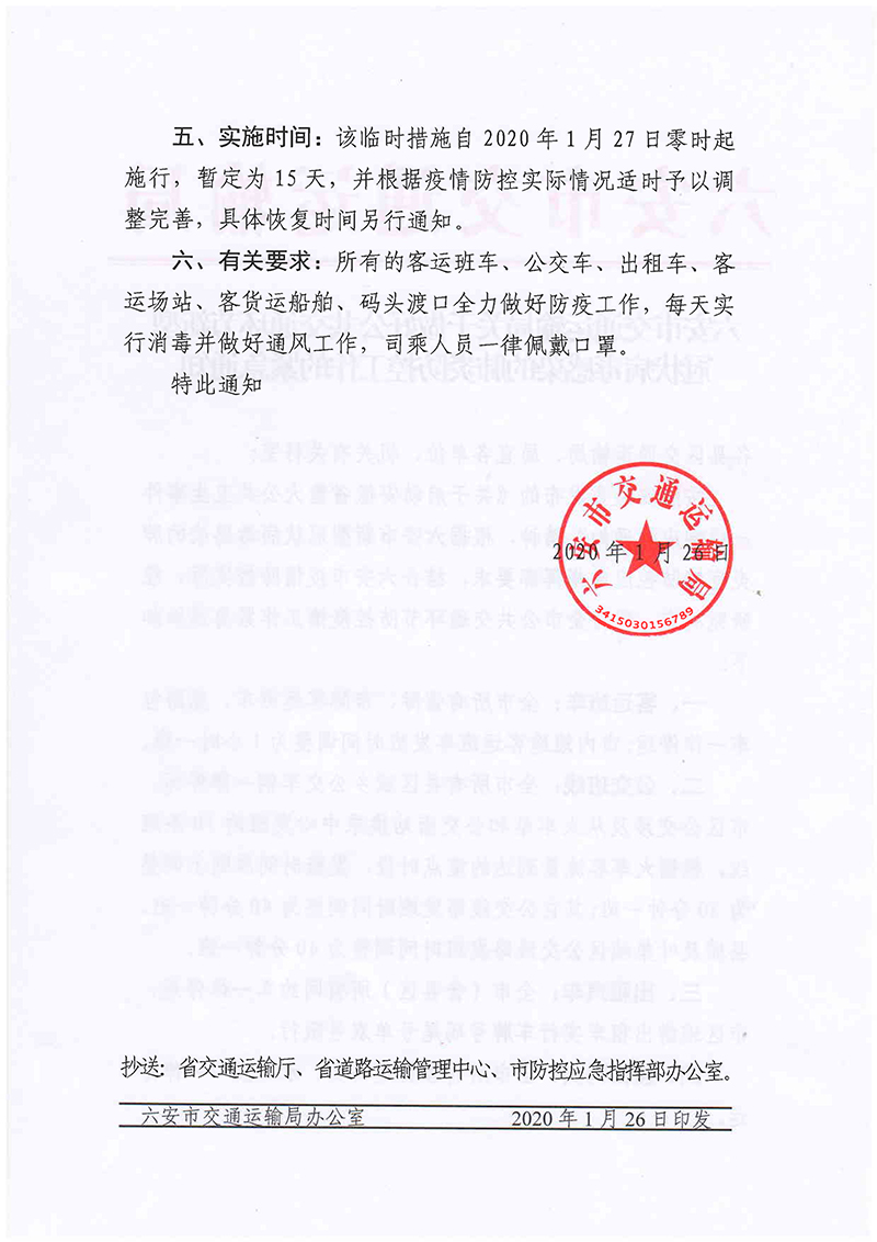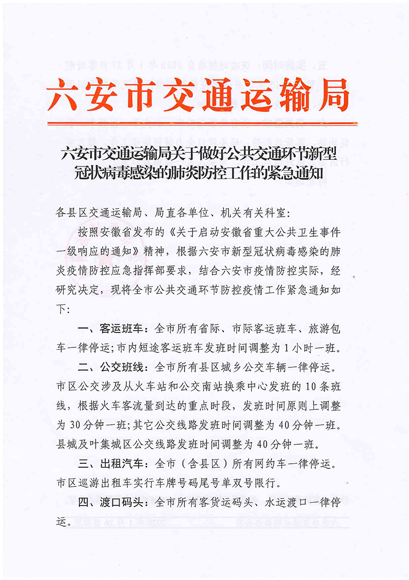 按照安徽省发布的《关于启动安徽省重大公共卫生事件一级响应的通知》精神,根据六安市新型冠状病毒感染的肺炎疫情防控应急指挥部要求,结合六安市疫情防控实际,六安市交通运输局下发了《关于做好公共交通环节新型冠状病毒感染的肺炎防控工作的紧急通知》,现将六安市城区、城乡公交运营调整事项通告如下。