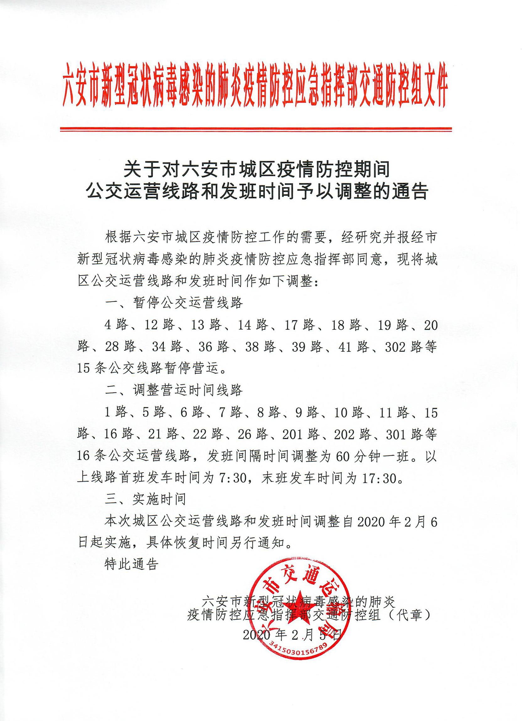 关于对六安市城区疫情防控期间公交运营线路和发班时间予以调整的通告