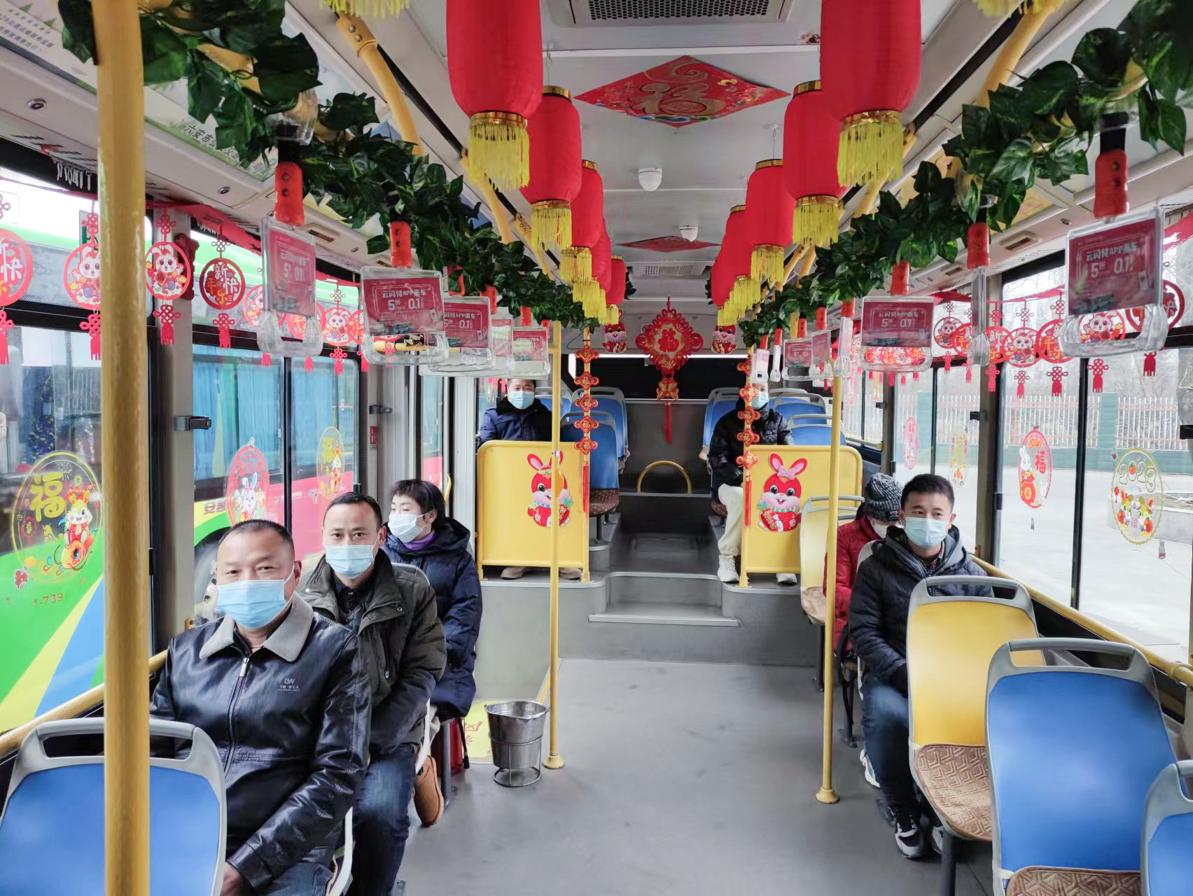 走进黄师傅的车厢,只见车厢里悬挂的大红灯笼充满喜庆色彩;鲜艳的中国结光彩艳丽,车窗上张贴的“兔年吉祥”“大吉大利”等各色窗花给人带来美的享受,兔年卡通画烘托出节日吉祥氛围……充满浓浓年味,装扮一新的车厢为市民送上了新春祝福,传递出公交人恪守人民至上的温暖情怀。同时座位上的暖心坐垫,为乘客提供了温馨的出行服务。年味车厢一上线,吸引了广大乘客的注意力,上车的乘客都被“年味”车厢内的别样景致所吸引,纷纷拿起手机拍照,记录下这欢乐祥和的喜庆场景。