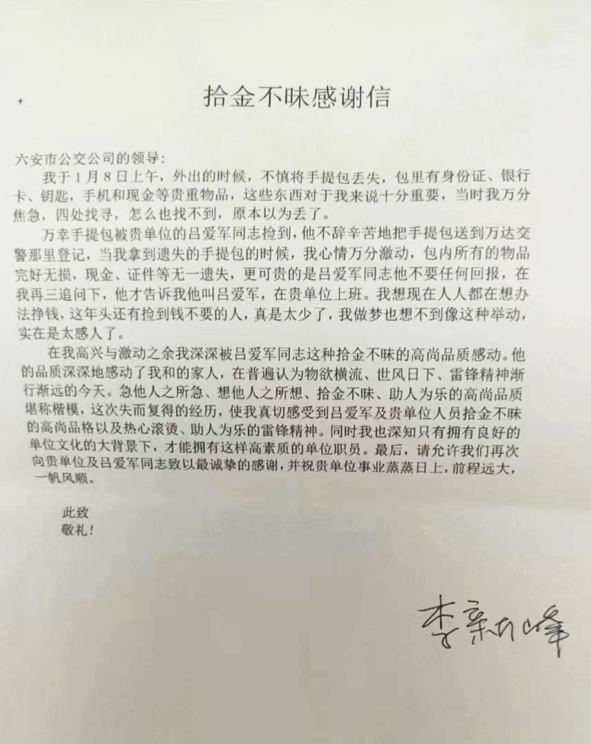 据了解,失主是外出的时候,不慎将手提包丢失,正在原路返回寻找时,接到了民警同志的电话,告知她手提包被人捡到并让她去领取。事后失主向市公交总公司送来了一封感谢信,赞扬吕爱军拾金不昧的高尚品格以及乐于助人的雷锋精神。