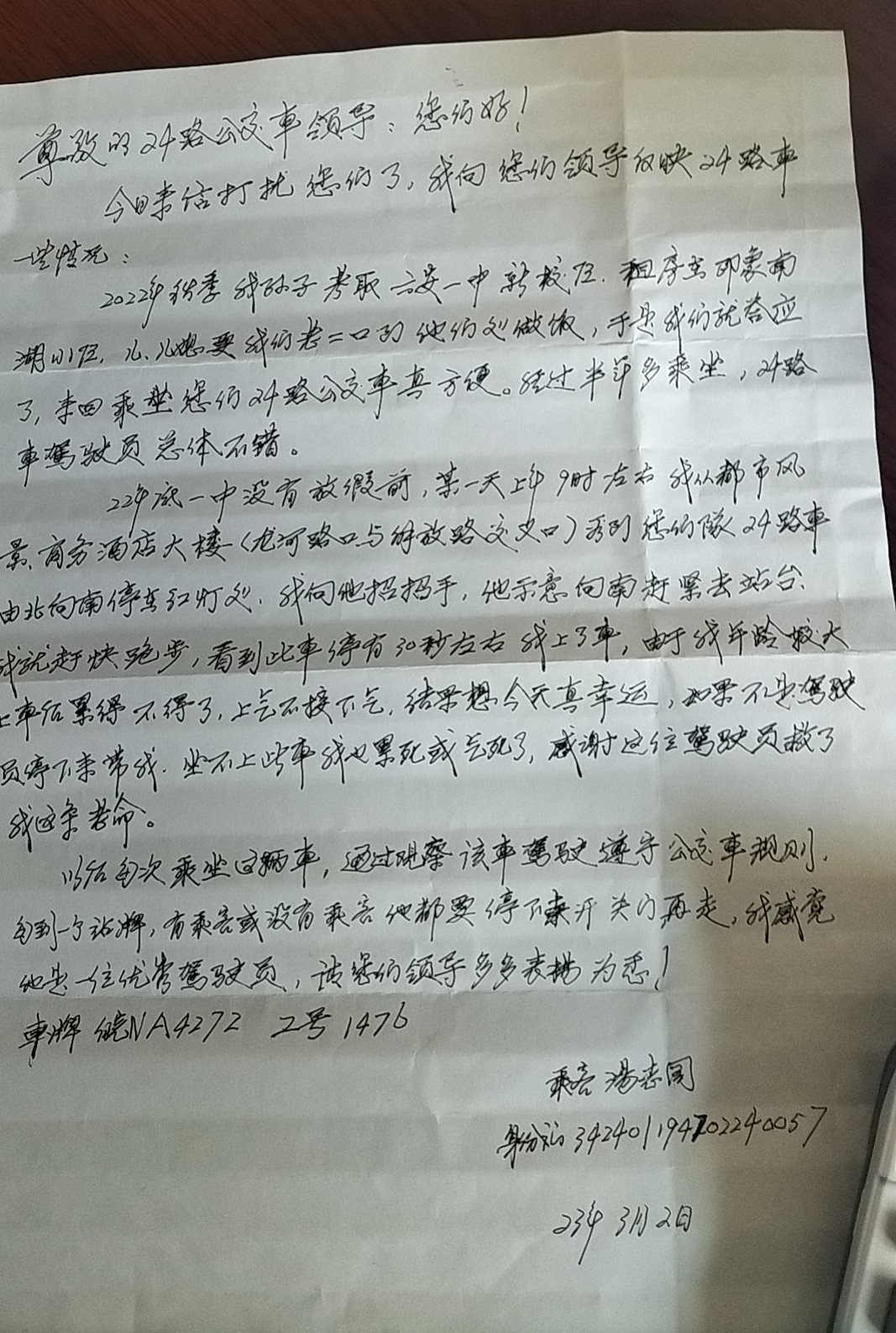 近日,六安公交收到一封特殊的表扬信,它由乘客汤志国老人亲笔手写而成,表达了对六安公交24路驾驶员杨成的赞扬和肯定。