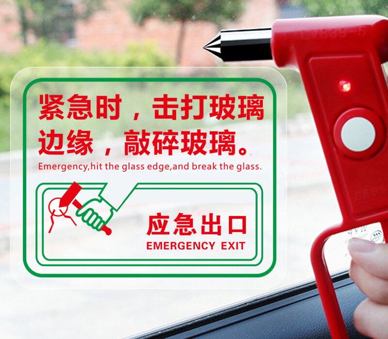 1、当遇到紧急情况时,首先取出安全锤,然后直接锤击钢化玻璃的四角和边缘位置(“紧急逃生敲击点”“应急出口”等标识张贴处)。应注意钢化玻璃的中间部分是最牢固的,一开始不要敲击中间部位。
