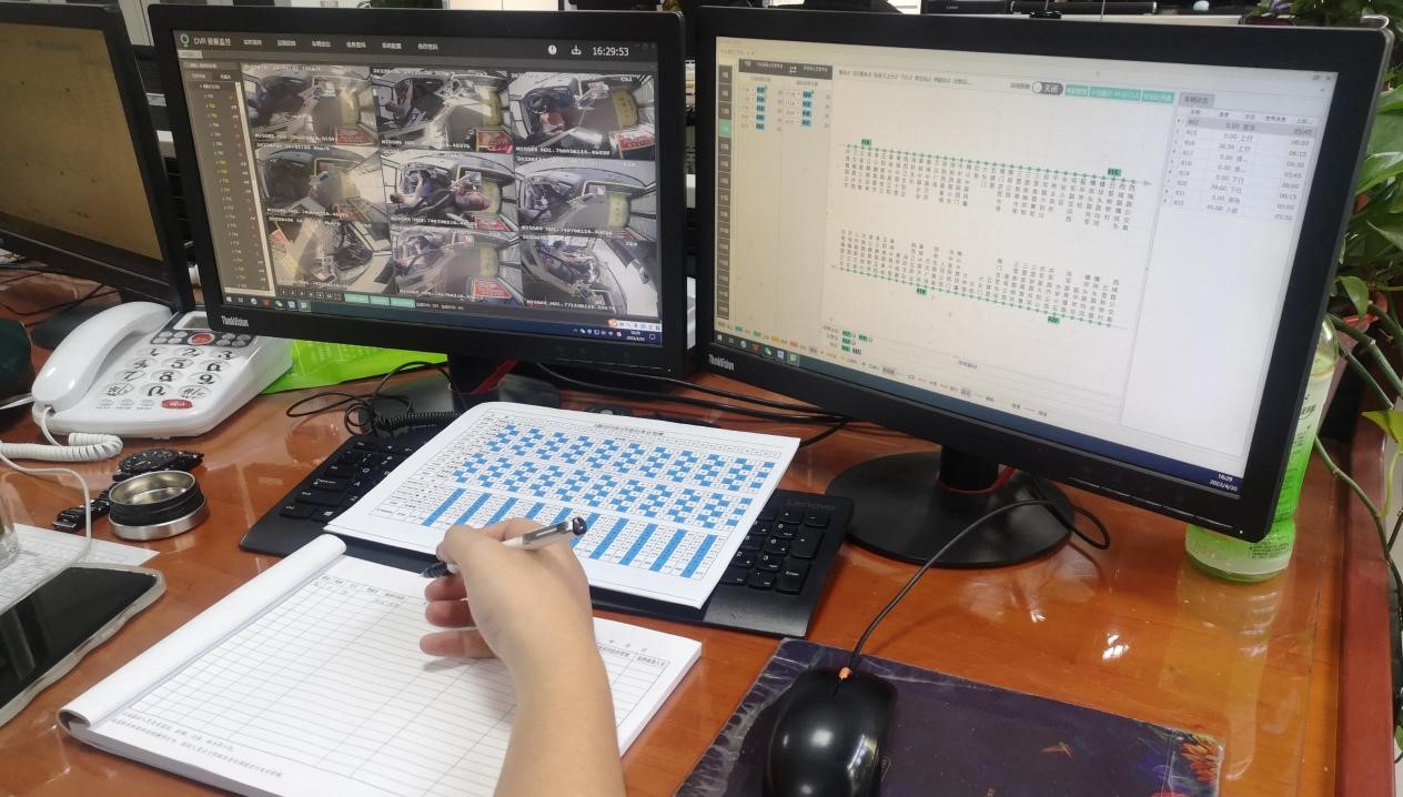 一位调度员正目不转睛地盯着电脑屏幕上的车载视频,通过实时视频传输,远程监控驾驶员工作中是否存在违规行为,如发现行车中接听电话、不系安全带、车速过快等违规违纪行为,及时提醒并通报给路队管理人员处理,确保车辆安全运营,确保广大乘客的乘车安全。
