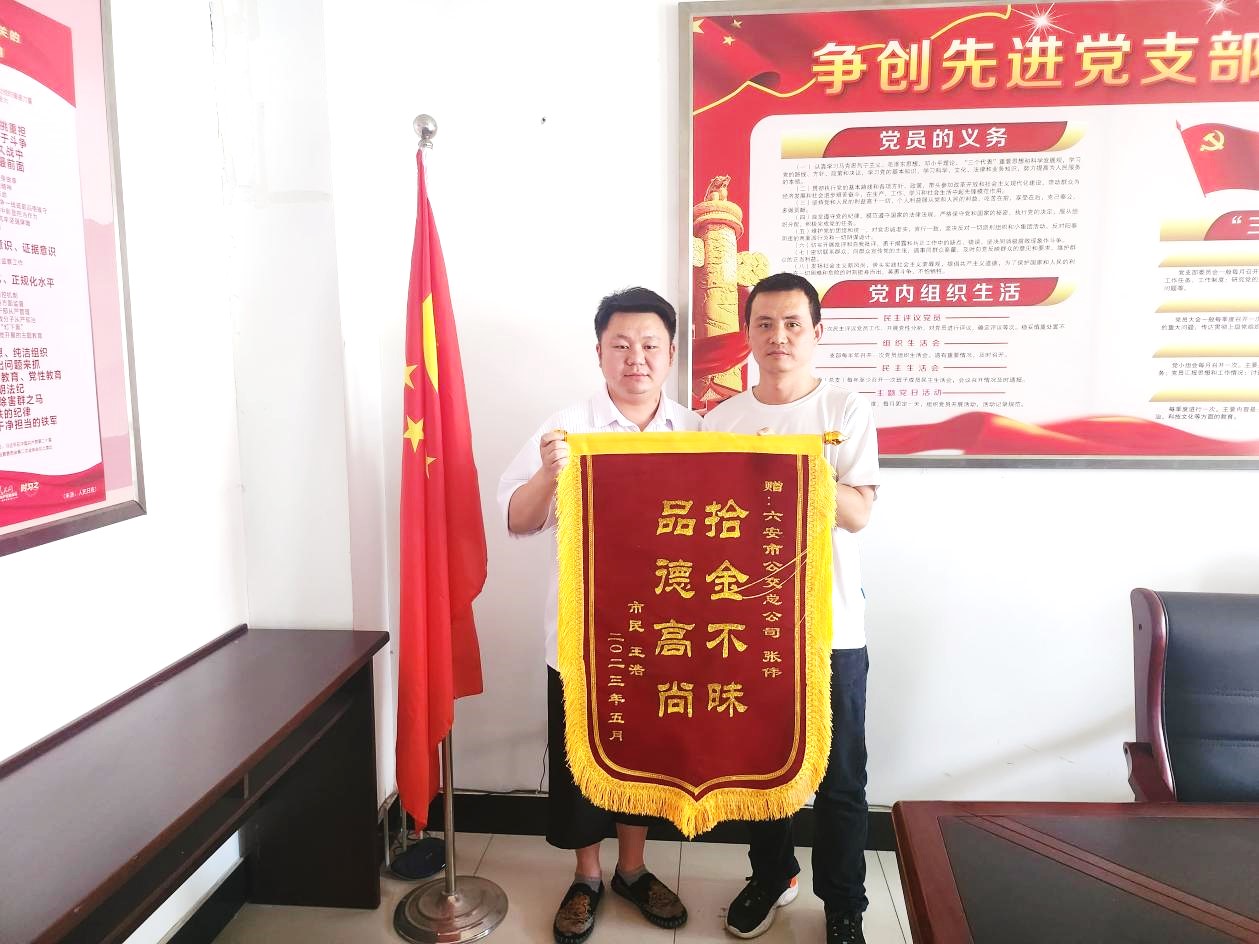 近日,失主王先生将一面“拾金不昧,品德高尚”的锦旗送到六安市公交总公司,感谢收款室张伟同志拾金不昧的行为。