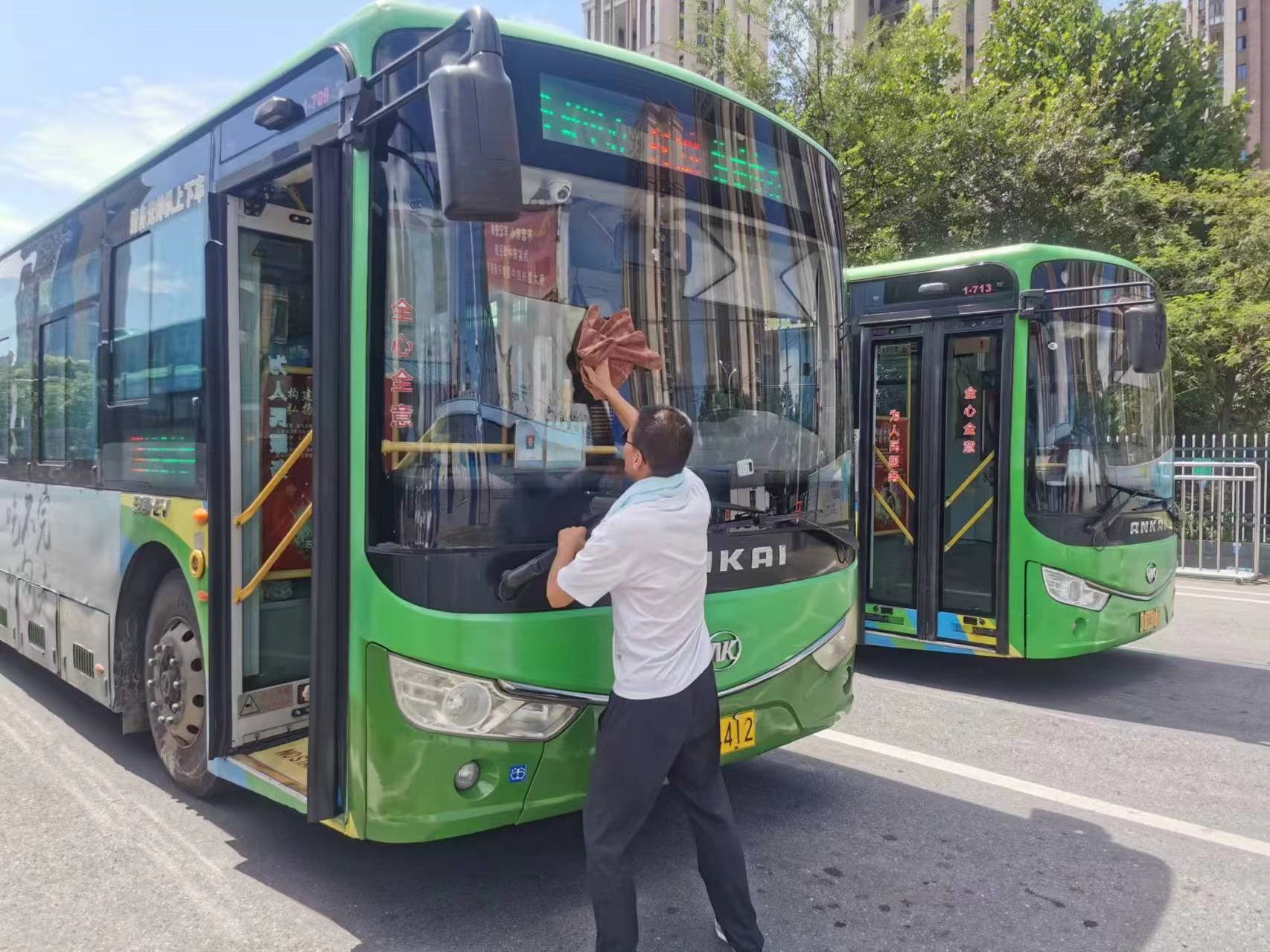 “高温天气,轮胎气压检查非常必要,如果轮胎气压过高,行驶途中爆胎的话,就会出现很大的危险。”湛晓磊一边说着,一边用扳手轻轻逐个敲击轮胎,确认胎压正常。紧接着,湛晓磊打上满满一桶水,拿着抹布、毛刷等工具细心擦拭着车厢的扶手和座椅。夏天行车,湛晓磊还有一个小技巧,每到乘客较多的站点,车辆驶出站台前,他都会在站台上多停留几秒钟,以防有的乘客在站牌后或树下“躲凉快”,怕乘客一没留意就错过了乘车。